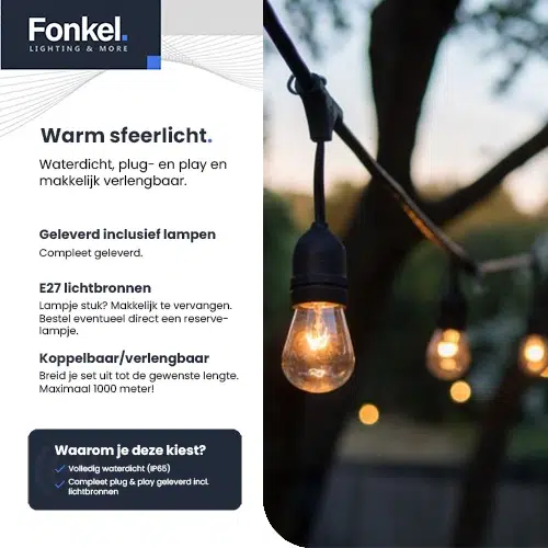20m 2200K LED Prikkabel – IP65 Lichtsnoer Buiten – koppelbaar – inclusief 20x E27 lampen – Extra warm wit – Eco – Incl. Stekker